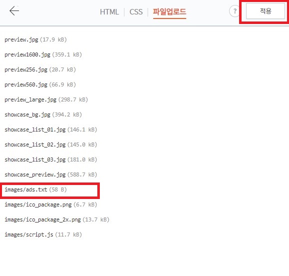 6. ads.txt가 잘 업로드되었다면 적용을 클릭하여 완료합니다.