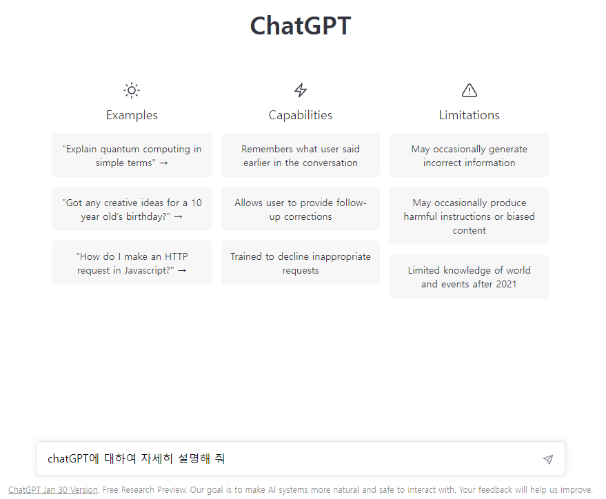 질문내용은 “chatGPT에 대하여 자세히 설명해 줘”였습니다.